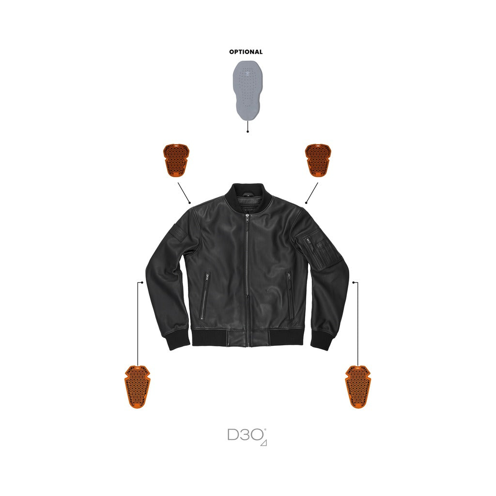Don’t forget to mention how FALCON LEATHER AVIATOR JACKET can protect your most vulnerable areas. It is fully CE approved – performance level AA in accordance with the EN 17092-3:2020 standard. D3O® Ghost™ CE level 1 approved elbow and shoulder armor included. For more protection you can also purchase QUATROFLEX CE Level 2 lightweight back armor.
