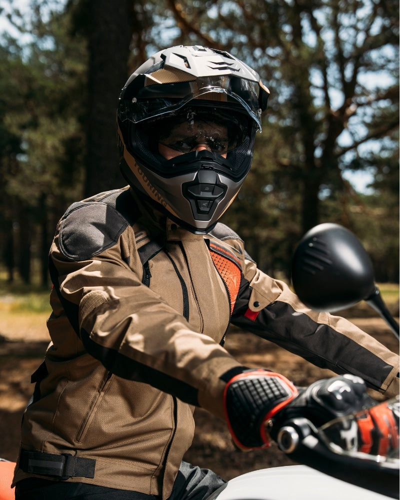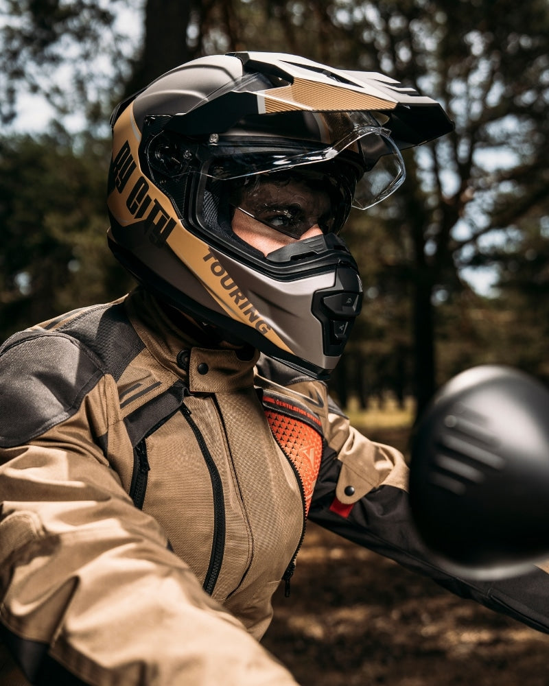 Rider with beige black adventure motorcycle helmet By City XTreme in outdoor riding position