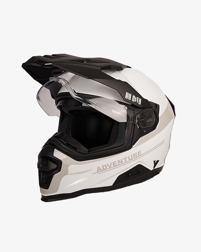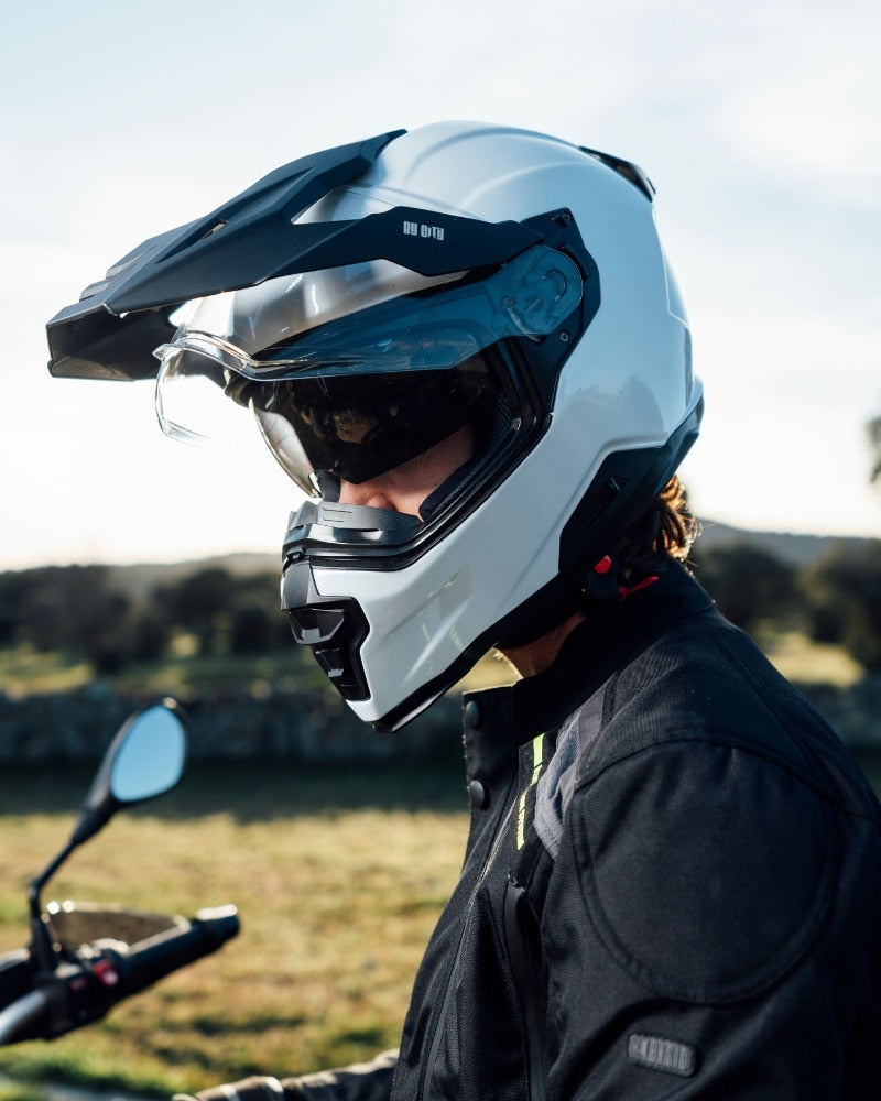 Rider wearing white By City XTreme adventure helmet side view outdoor riding