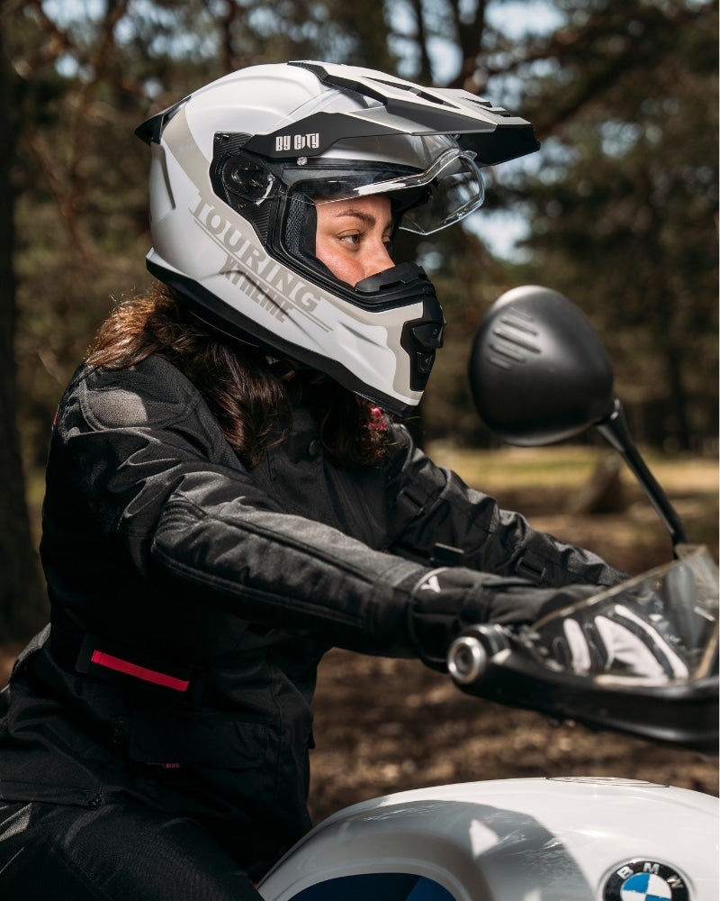 Female rider with white adventure motorcycle helmet By City XTreme touring style