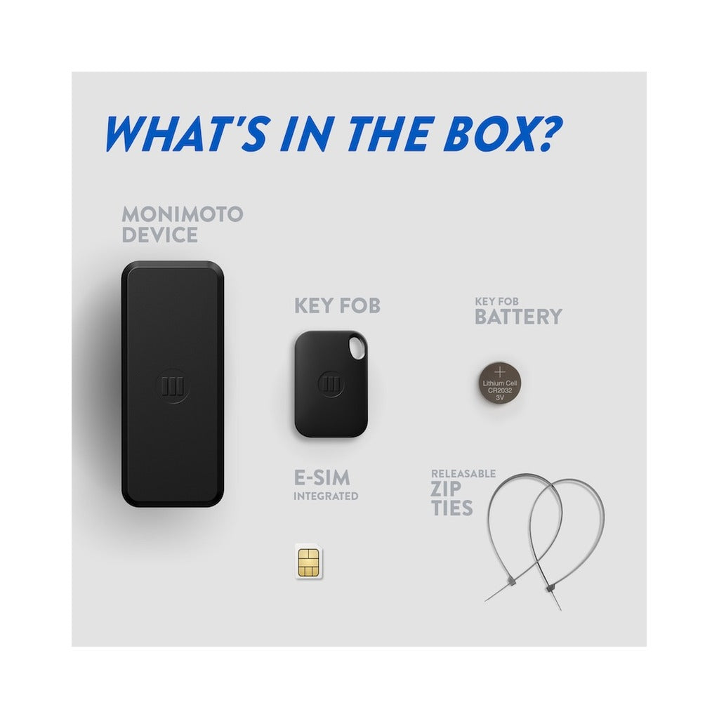 What’s in the box: Monimoto 9 device, key fob, battery, eSIM and zip ties