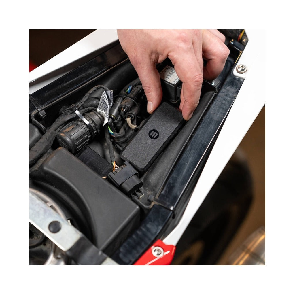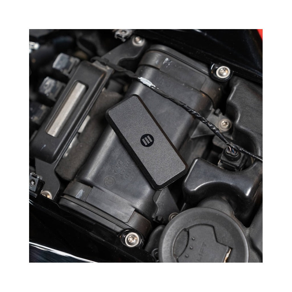 Monimoto 9 GPS tracker installed on a motorcycle engine bay